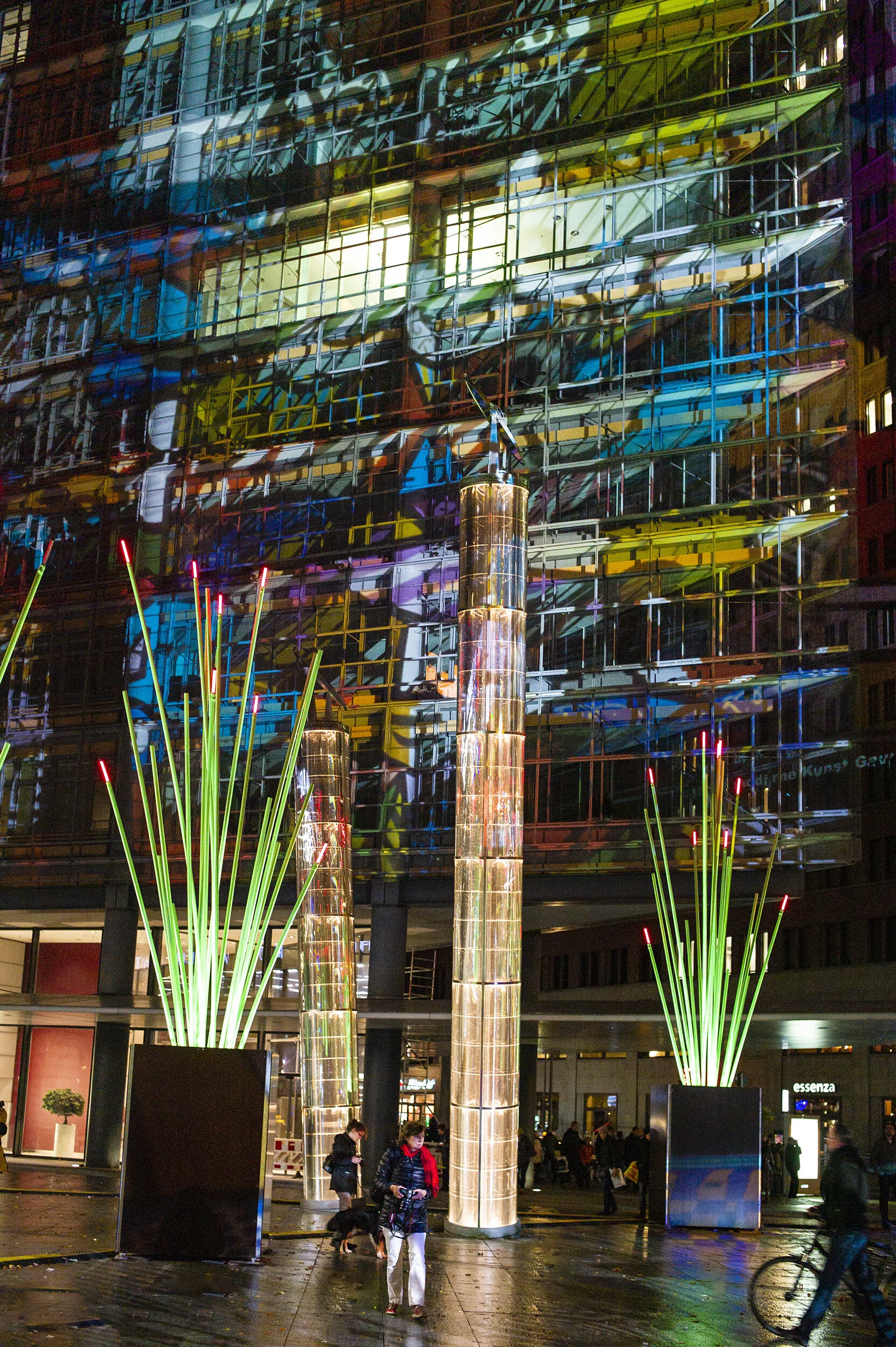 One evening at a plaza in Potsdamer Platz there was a light show in which images were projected onto the buildings lining the plaza.
